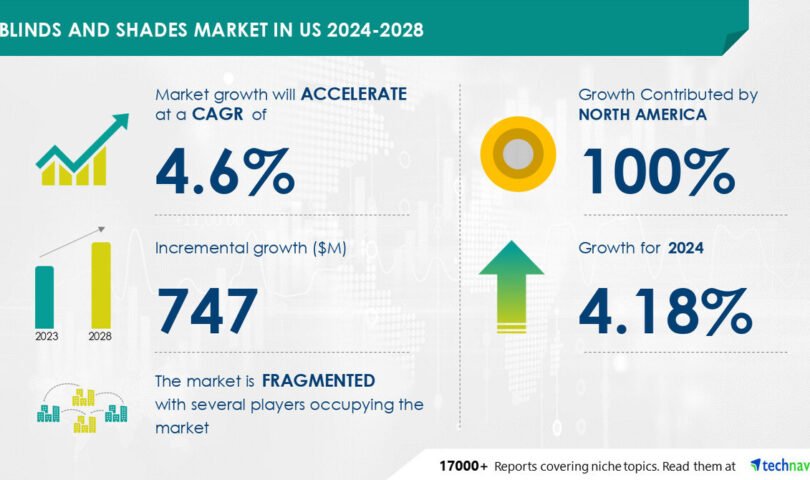 NEW YORK, July 9, 2024 /PRNewswire/ — The blinds and sun shades marketplace in america is estimated to develop by means of USD 747 million from 2024-2028, at a CAGR of about 4.6%, in line with Technavio. The rising development trade in america is using marketplace enlargement, with a pattern against the larger affect of arranged retailing. Alternatively, volatility in uncooked subject material costs poses a problem. Key marketplace gamers come with Pronunciation Design, Alta Window Models, American Material Programs Inc., Blinds To Exit Inc., Funds Blinds LLC, Colorado Field Answers, Crown Silhoutte Co., Hunter Douglas NV, and extra.