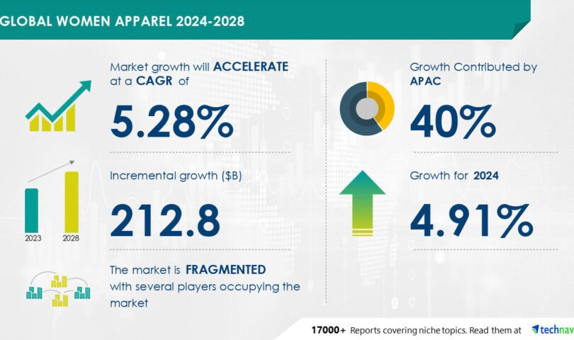 NEW YORK, July 10, 2024 /PRNewswire/ — The worldwide girls attire marketplace dimension is estimated to develop by means of USD 212.8 billion from 2024-2028, in line with Technavio. The marketplace is estimated to develop at a CAGR of 5.28% all through the forecast duration. Rising traits within the world girls’s attire marketplace come with sustainable model practices, with shoppers an increasing number of prioritizing eco-friendly and ethically sourced clothes. Personalization thru AI and heavy information analytics is bettering buyer studies, tailoring merchandise to particular person personal tastes. Moreover, the get up of direct-to-consumer fashions and digital-first methods is reshaping distribution channels, providing comfort and accessibility. Regardless of demanding situations from counterfeit merchandise, the marketplace’s enlargement is propelled by means of premiumization efforts from established manufacturers and cutting edge applied sciences like digital fact to counterpoint the buying groceries exit, making sure persisted enlargement thru 2028.