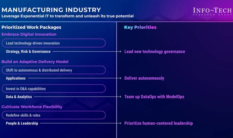 “The role of IT in this transformation is nothing short of critical. Advanced IT maturity will be essential to integrating new technologies into existing manufacturing ecosystems as well as enabling seamless connectivity, data integrity, and system security,” explains Shukla. “CIOs are beginning to take center stage in navigating industry challenges effectively and steering their organizations toward a future that is more efficient, sustainable, and profitable. This is why it is crucial for CIOs to understand the working priorities that underpin the use of Exponential IT and use these concepts to their advantage.”