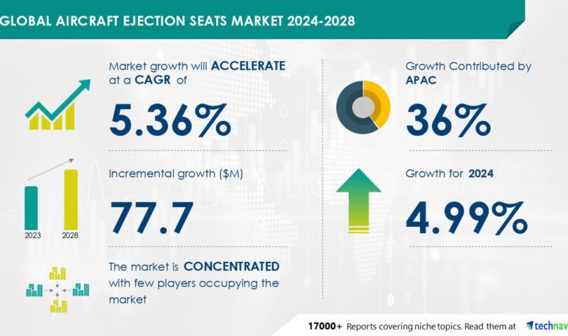 NEW YORK, July 12, 2024 /PRNewswire/ — The worldwide plane ejection seats marketplace is estimated to develop through USD 77.7 million from 2024-2028, at a CAGR of five.36%, pushed through expanding call for for army plane globally and up to date trends in ejection seats. Key avid gamers come with Airborne Programs, BAE Programs Plc, Martin-Baker Airplane Co. Ltd., and others. Other international locations’ protection budgets considerably affect this marketplace, as upper budgets top to higher procurement of complex army plane and ejection seats, era charge constraints related to those seats pose a problem.