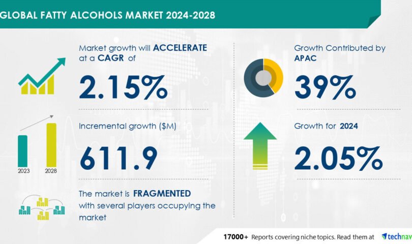NEW YORK, July 15, 2024 /PRNewswire/ — The worldwide fatty alcohols marketplace measurement is estimated to develop through USD 611.9 million from 2024-2028, in keeping with Technavio. The marketplace is estimated to develop at a CAGR of over 2.15% all the way through the forecast duration. Rising call for for commercial and institutional cleaners is using marketplace enlargement, with a pattern against rising call for for biosurfactants. Alternatively, fluctuating uncooked subject material costs of fatty alcohols poses a problem. Key marketplace gamers come with AVRIL SCA, BASF SE, CREMER OLEO GmbH and Co. KG, Croda Global Plc, Eastman Chemical Co., Ecogreen Oleochemicals PTE Ltd., Evonik Industries AG, Godrej and Boyce Production Co. Ltd., Jarchem Industries Inc., Kao Corp., Kuala Lumpur Kepong Berhad, Musim Mas Workforce, Sasol Ltd., Saudi Unsophisticated Industries Corp., Shell plc, Sime Darby Plantation Berhad, The Procter and Gamble Co., Timur OleoChemicals Malaysia Sdn. Bhd., VVF LLC, and Wilmar Global Ltd..
