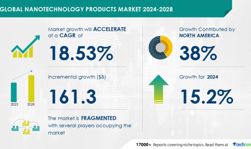NEW YORK, July 16, 2024 /PRNewswire/ — The global nanotechnology products market size is estimated to grow by USD 161.3 billion from 2024-2028, according to Technavio. The market is estimated to grow at a CAGR of 18.53% during the forecast period. Increasing adoption of novel nanotechnology tools to boost agricultural productivity is driving market growth, with a trend towards growing demand for carbon nanotube-based touchscreens. However, high cost of production poses a challenge. Key market players include 3M Co., Advanced Nano Products Co. Ltd., Applied Materials Inc., Arkema Group, BASF SE, Bruker Corp., Covestro AG, Dow Chemical Co., DuPont de Nemours Inc., Kleindiek Nanotechnik GmbH, Nano C Inc., Nano Magic Inc., Nanophase Technologies Corp., Nanosys Inc., PPG Industries Inc., Smiths Group Plc, Synopsys Inc., Taiwan Semiconductor Manufacturing Co. Ltd., Thermo Fisher Scientific Inc., and Zyvex Corp..