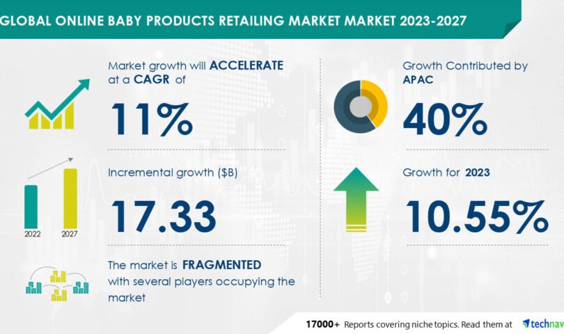 NEW YORK, July 18, 2024 /PRNewswire/ — The global online baby products retailing market market size is estimated to grow by USD 17.33 billion from 2023-2027, according to Technavio. The market is estimated to grow at a CAGR of 11% during the forecast period. Competitive pricing and discounts on baby products is driving market growth, with a trend towards growing omnichannel retailing. However, availability of counterfeit baby products poses a challenge. Key market players include Alibaba Group Holding Ltd., Amazon.com Inc., Baby Earth, Babydash Sdn Bhd, Babyshop Group, Bed Bath and Beyond Inc., Best Buy Co. Inc., Brainbees Solutions Pvt. Ltd., DRESS CODE, eBay Inc., J Sainsbury plc, Kidsroom, Mumzworld.com, Otway Technology Pty Ltd., Pupsik Studio LLP, Qurate Retail Inc., Rakuten Group Inc., Saks Direct Inc., The Walt Disney Co., and Tru Kids Brand.