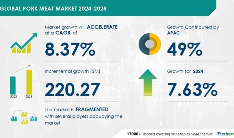 NEW YORK, July 18, 2024 /PRNewswire/ — The global pork meat market size is estimated to grow by USD 220.27 million from 2024-2028, according to Technavio. The market is estimated to grow at a CAGR of almost 8.37% during the forecast period. Increasing demand for grass-fed and organic pork is driving market growth, with a trend towards new pork processing technology. However, stringent regulations for processed meat manufacturing poses a challenge. Key market players include Bridgford Foods Corp., Charoen Pokphand Foods PCL, China Yurun Food Group Ltd., Conagra Brands Inc., Cooperl, Cranswick Plc, Danish Crown AS, Dawn Pork and Bacon, Gordon Food Service Inc., Hormel Foods Corp., Iowa Select Farms, JBS SA, New Hope Liuhe Co. Ltd., The Maschhoffs LLC, Toennies Group, Triumph Foods LLC, Tyson Foods Inc., Vion Holding NV, WH Group Ltd., and VALL COMPANYS GROUP.