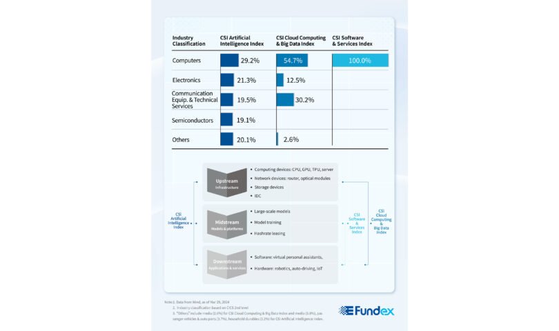 While the CSI Artificial Intelligence Index covers the entire AI value chain, with computers, electronics, and communication equipment and technical services industries as the top three, the CSI Cloud Computing & Big Data Index focuses on upstream computing devices and downstream applications, with over 50% exposure to the computers industry.