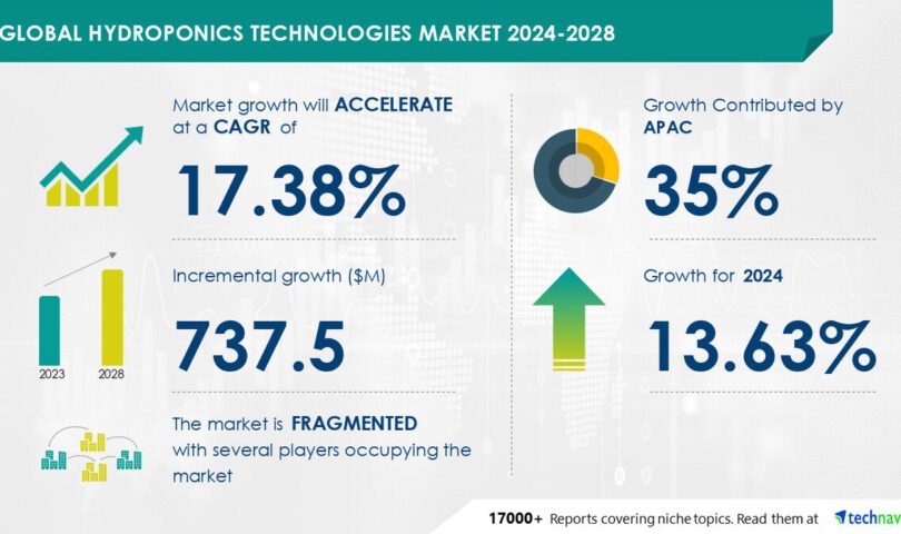 NEW YORK, July 19, 2024 /PRNewswire/ — The global hydroponics technologies market size is estimated to grow by USD 737.5 million from 2024-2028, according to Technavio. The market is estimated to grow at a CAGR of almost 17.38% during the forecast period. Facilitation in soil and space-saving is driving market growth, with a trend towards increase in offering of advanced hydroponic growing systems. However, high investment cost of hydroponics technologies poses a challenge. Key market players include AmHydro, Argus Control Systems Ltd., Brio Agri Producer Co. Ltd., Cox Enterprises Inc., Fork Farms, Greentech Organic Hydroponics Systems Mfrs., GrowLife Inc, Hawthorne Gardening Co., Heliospectra AB, Hortisystems UK Ltd., Hydrodynamics International Inc., Koninklijke Philips N.V., KUBO TUINBOUWPROJECTEN BV, LOGIQS B.V., MSc on smArt Agriculture TECHnologies, Nutrifresh Farm Tech India Pvt. Ltd., Rise Hydroponics, Thanet Earth Ltd., Valoya Oy, and Village Farms International Inc..