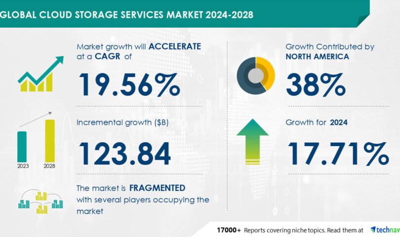 NEW YORK, July 23, 2024 /PRNewswire/ — The global cloud storage services market size is estimated to grow by USD 123.84 billion from 2024-2028, according to Technavio. The market is estimated to grow at a CAGR of 19.56% during the forecast period. Growth in data generation is driving market growth, with a trend towards high adoption of cloud storage services by smes. However, vendor lock-in issues poses a challenge. Key market players include Alibaba Group Holding Ltd., Alphabet Inc., Amazon.com Inc., Cloud Software Group Inc., Dell Technologies Inc., Fujitsu Ltd., Hewlett Packard Enterprise Co., Hitachi Ltd., Huawei Technologies Co. Ltd., International Business Machines Corp., InterVision Systems LLC, Microsoft Corp., NetApp Inc., Nutanix Inc., Oracle Corp., Pure Storage Inc., Rackspace Technology Inc., ServiceNow Inc., Tencent Holdings Ltd., and Toshiba Corp..