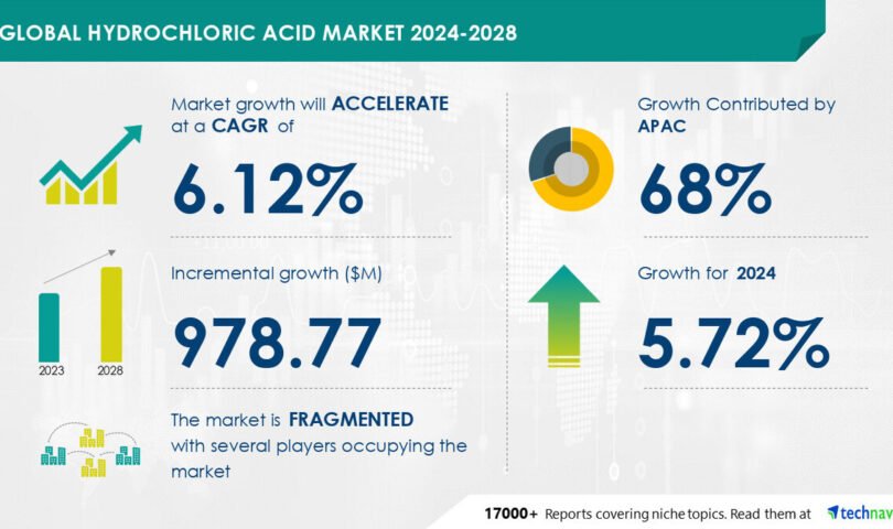 NEW YORK, July 23, 2024 /PRNewswire/ — The worldwide hydrochloric acid marketplace measurement is estimated to develop through USD 978.77 million from 2024-2028, in line with Technavio. The marketplace is estimated to develop at a CAGR of 6.12% all through the forecast duration. Rising call for for PVC is using marketplace expansion, with a pattern in opposition to expanding demand-supply hole. Alternatively, availability of substitutes for hydrochloric acid poses a problem. Key marketplace gamers come with AGC Inc., BASF SE, Coogee, Covestro AG, ERCO International, FSTI Inc., INOVYN Europe Ltd., Italmatch Chemical compounds Spa, Jones Hamilton Co., Kemira Oyj, Merck KGaA, Occidental Petroleum Corp., Olin Corp., PCC SE, Qingdao Hisea Chem Co. Ltd., Shiva Team, SPOLANA s.r.o., Tessenderlo Team NV, W.Ok. Merriman Inc., and Westlake Corp..