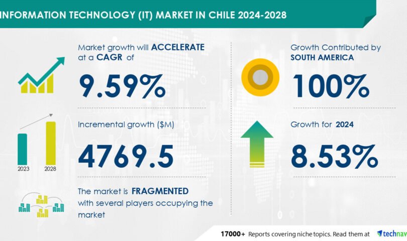 NEW YORK, July 24, 2024 /PRNewswire/ — The information technology (IT) market size in Chile is estimated to grow by USD 4.76 billion from 2024-2028, according to Technavio. The market is estimated to grow at a CAGR of 9.59% during the forecast period. Increased adoption of cloud-based services is driving market growth, with a trend towards emergence of AI. However, data privacy and security risk in cloud-based services poses a challenge. Key market players include Accenture Plc, ADEXUS S.A, Alphabet Inc., Amisoft, Atos SE, Cisco Systems Inc., Dassault Systemes SE, Deloitte Touche Tohmatsu Ltd., HCL Technologies Ltd., Hewlett Packard Enterprise Co., Infosys Ltd., International Business Machines Corp., Microsoft Corp., NetApp Inc., Oracle Corp., SAP SE, Schneider Electric SE, SONDA S.A., Tata Consultancy Services Ltd., and Verizon Communications Inc..