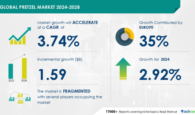 NEW YORK, July 24, 2024 /PRNewswire/ — The global pretzel market size is estimated to grow by USD 1.59 billion from 2024-2028, according to Technavio. The market is estimated to grow at a CAGR of about 3.74% during the forecast period. Evolving taste preferences of consumers is driving market growth, with a trend towards packaging innovations increase shelf life. However, fluctuations in price of raw material used in production of pretzels poses a challenge. Key market players include Campbell Soup Co., Focus Brands LLC, General Mills Inc., Herr Foods Inc., Intersnack Group GmbH and Co. KG, J and J Snack Foods Corp., Jamba Juice Franchisor SPV LLC, Kellogg Co., Mars Inc., Mr. Pretzels, Old Dutch Foods Ltd., PepsiCo Inc., Quinn Foods LLC, Real Food From The Ground Up, Soft Pretzel Franchise Systems Inc., The Hershey Co., Tyson Foods Inc., Utz Brands Inc., WE RE ROLLING PRETZEL CO., and Wetzels Pretzels LLC.