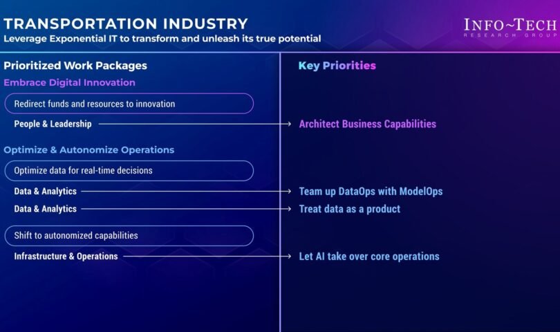 Info-Tech’s research findings underscore the transformative potential of Exponential IT for the transportation and logistics industry. The firm recommends that by prioritizing the key areas of architecting business capabilities, integrating DataOps with ModelOps, treating data as a product, and leveraging AI for core operations, IT leaders can drive substantial improvements in efficiency, innovation, and competitive positioning.