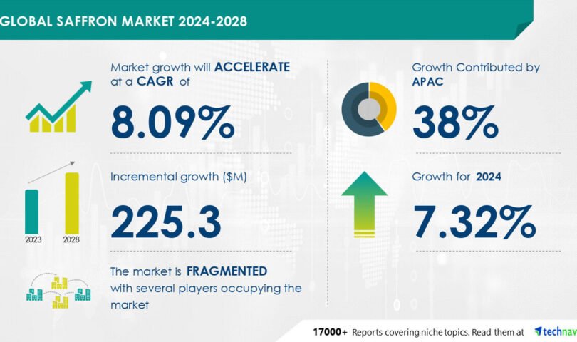 NEW YORK, July 25, 2024 /PRNewswire/ — The global saffron market size is estimated to grow by USD 225.3 million from 2024-2028, according to Technavio. The market is estimated to grow at a CAGR of 8.09% during the forecast period. Growing use in the pharmaceutical and cosmetics industries is driving market growth, with a trend towards expansion of saffron cultivation. However, high production costs of saffron poses a challenge .Key market players include Al Hasad Al Fakher Trading Est., AZAFRANES MANCHEGOS SL, Esfedan Saffron Co., Gohar Saffron Co., Grandor Co., Green Leaves International, King Kesariya, La Casa de los Aromas S.L., Mehr Saffron, Norfolk Saffron, Novin Saffron Co., Organic Spices Inc., Rowhani Saffron Co., Rumi Spice, Safrante Specialty Foods S.A., Societa Agricola Baghini Buonacara Srls, The Cheshire Saffron Co., The Great American Spice Co., Trond Saffron Qain Co., and USMS Saffron Co. Inc..