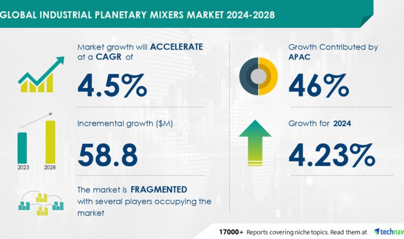 NEW YORK, July 29, 2024 /PRNewswire/ — The global industrial planetary mixers market size is estimated to grow by USD 58.8 million from 2024-2028, according to Technavio. The market is estimated to grow at a CAGR of 4.5% during the forecast period. Need to ensure efficient mixing of high viscous products in various industries is driving market growth, with a trend towards new product launches. However, increasing availability of industrial planetary mixers on toll poses a challenge. Key market players include Arun Group of companies, Buhler AG, Charles Ross and Son Co., Custom Milling and Consulting LLC, Erich NETZSCH GmbH and Co. Holding KG, Escher Mixers srl, Ferneto, Ing. Polin E CSpA, Jaygo Inc., Jinhu Ginhong Machinery Co. Ltd., Li Yuan Machine Industrial Pte Ltd., Sancassiano Spa, Scudo Srl, Sigma Srl, Sower dimensional mechanical and electrical equipment co. Ltd., Starmix Srl, Tonelli Group Spa, VMI Mixing, Wuxi YK Automation Technology co. Ltd., and Zanelli Srl.