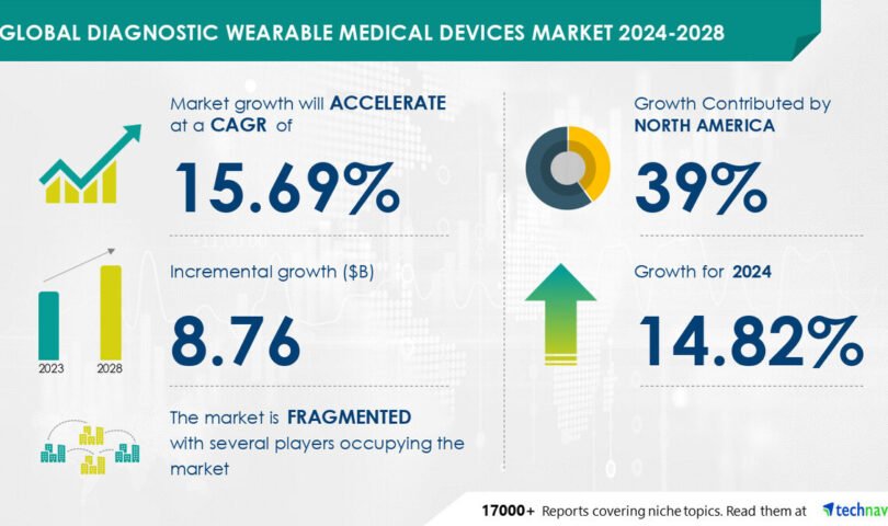 NEW YORK, July 31, 2024 /PRNewswire/ — The global diagnostic wearable medical devices market size is estimated to grow by USD 8.76 billion from 2024-2028, according to Technavio. The market is estimated to grow at a CAGR of 15.69% during the forecast period. Increasing prevalence of chronic diseases is driving market growth, with a trend towards increasing penetration of diagnostic wearable medical devices in medical sector. However, issues with user acceptance and adherence to diagnostic wearable medical devices poses a challenge. Key market players include Activinsights Ltd., AliveCor Inc., Alphabet Inc., Apple Inc., Boyd Corp., BTS Bioengineering Corp., Cleveland Medical Devices Inc., Dragerwerk AG and Co. KGaA, Johari Digital India Ltd., Koninklijke Philips N.V., Medtronic Plc, Meril Life Sciences Pvt. Ltd., Molex LLC, Murata Vios, Inc., OMRON Corp., ResMed Inc., Sanmina Corp., VitalConnect Inc., Wellue Health, and Intelesens Ltd..