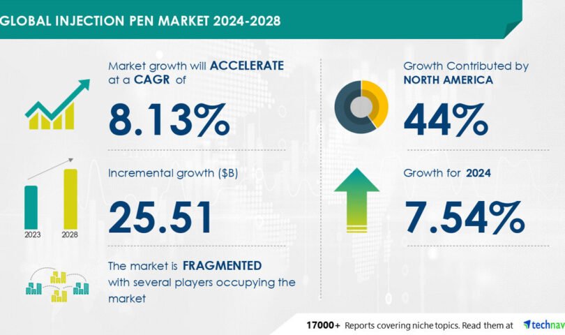 NEW YORK, July 31, 2024 /PRNewswire/ — The global injection pen market size is estimated to grow by USD 25.51 bn from 2024-2028, according to Technavio. The market is estimated to grow at a CAGR of 8.13% during the forecast period. Rising prevalence of chronic diseases is driving market growth, with a trend towards significant rise in demand for insulin pens. However, side-effects of injection pens poses a challenge. Key market players include AstraZeneca Plc, Becton Dickinson and Co., Biocon Ltd., Eli Lilly and Co., F. Hoffmann La Roche Ltd., Gan and Lee Pharmaceuticals Co. Ltd., Gerresheimer AG, GlaxoSmithKline Plc, Harro Hofliger GmbH, Haselmeier GmbH, Jiangsu Delfu medical device Co. Ltd., Merck KGaA, Novartis AG, Novo Nordisk AS, Owen Mumford Ltd., Pfizer Inc., Sanofi, Solteam Electronics Co LTD., Viatris Inc., and Ypsomed Holding AG.