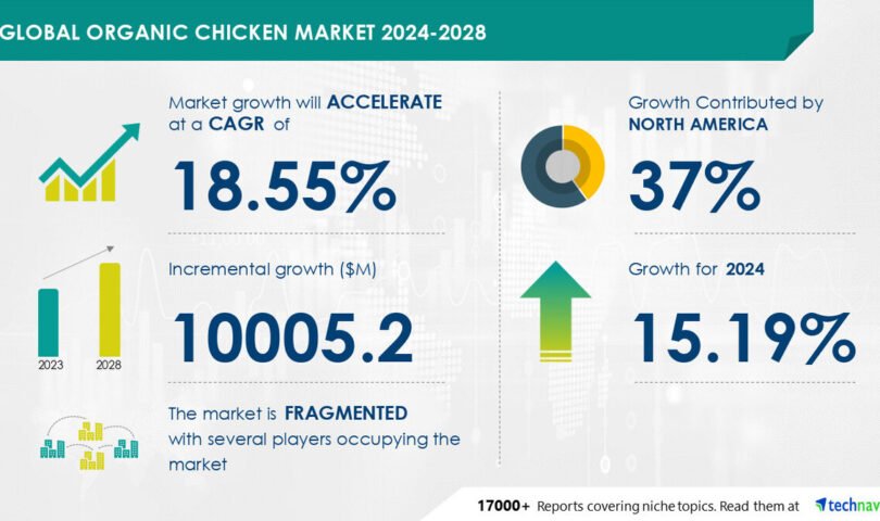 NEW YORK, Aug. 1, 2024 /PRNewswire/ — The worldwide natural hen marketplace dimension is estimated to develop via USD 10.00 billion from 2024-2028, in step with Technavio. The marketplace is estimated to develop at a CAGR of 18.55% right through the forecast duration. Huge product vary together with simple availability of natural hen is riding marketplace enlargement, with a development in opposition to importance of blockchain for making improvements to provide chain transparency. On the other hand, stringent regulations and laws poses a problem. Key marketplace gamers come with AgroTrak, Ayrshire Farm, Azure Usual, Bell and Evans, Daulat Farms Workforce, Farmer Focal point, Foster Farms, Complete Moon Farm, Greener Pastures Rooster, Hershberger Heritage Farm, Inglewood Natural, JBS SA, Many Fingers Natural Farm, Nicks Natural Farm, Perdue Farms Inc., Plukon Meals Workforce BV, The Hain Celestial Workforce Inc., Tyson Meals Inc., Fallacious Path Farm, and Zorabian Chicks Pvt. Ltd..