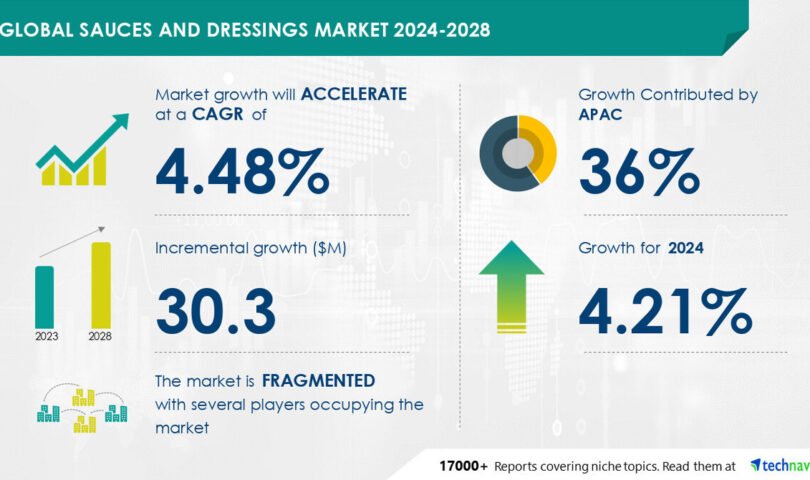 NEW YORK, Aug. 5, 2024 /PRNewswire/ — The global sauces and dressings market size is estimated to grow by USD 30.3 million from 2024-2028, according to Technavio. The market is estimated to grow at a CAGR of 4.48% during the forecast period. New product launches is driving market growth, with a trend towards emergence of private label brands. However, fluctuating raw material prices poses a challenge. Key market players include Campbell Soup Co., Coles Group Ltd., Conagra Brands Inc., General Mills Inc., Haven Row LLC, Hope Foods LLC, Hormel Foods Corp., Kikkoman Corp., Kinneret Farm LTD, Lee Kum Kee, Mars Inc., McCormick and Co. Inc., McDonald Corp., Nandos Group, Nestle SA, PepsiCo Inc., Sabra Dipping Co. LLC, SAJJ Mediterranean, Sweet Baby Rays, The Kraft Heinz Co., and Unilever PLC.