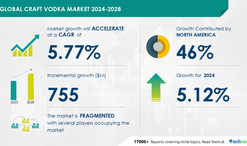 NEW YORK, Aug. 6, 2024 /PRNewswire/ — The global craft vodka market size is estimated to grow by USD 755 million from 2024-2028, according to Technavio. The market is estimated to grow at a CAGR of 5.77% during the forecast period. Increased demand for flavored vodka is driving market growth, with a trend towards impact of social media and blogging sites. However, increasing competition from other alcoholic beverages poses a challenge. Key market players include 44 North Vodka, 619 Spirits North Park, Alcobrew Distilleries India Ltd., Bainbridge Organic Distillers, Beam Suntory Inc., BrewDog Plc, Candella Micro Distillery, Cardinal Spirits, Charbay Distillery, Diageo Plc, Fifth Generation Inc., Hanson Spirits LLC, Long Road Distellers, Pernod Ricard SA, Rogue Ales and Spirits, Sazerac Co. Inc., St. George Spirits, Toms Town Distilling Co, William Grant and Sons Ltd, and Woody Creek Distellers.