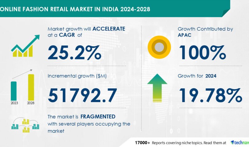 NEW YORK, Aug. 6, 2024 /PRNewswire/ — The web trend retail marketplace dimension in Bharat is estimated to develop by way of USD 51.79 billion from 2024-2028, in line with Technavio. The marketplace is estimated to develop at a CAGR of  25.2%  throughout the forecast duration.  Get up in web and smartphone penetration is using marketplace enlargement, with a pattern in opposition to be on one?s feet of social media. Alternatively, presence of cost limitations  poses a problem. Key marketplace avid gamers come with Adidas AG, Aditya Birla Control Corp. Pvt. Ltd., Alibaba Crew Maintaining Ltd., Amazon.com Inc., Benetton Crew Srl, Dolce and Gabbana S.r.l., eBay Inc., Gildan Activewear SRL, GioTech, H and M Hennes and Mauritz GBC AB, Levi Strauss and Co., Naaptol On-line Buying groceries Pvt. Ltd., One97 Communications Ltd., Reliance Industries Ltd., Customers Oppose Ltd., Snapdeal Ltd., Tata Sons Pvt. Ltd., The Hole Inc., V Mart Retail Ltd., and Walmart Inc..
