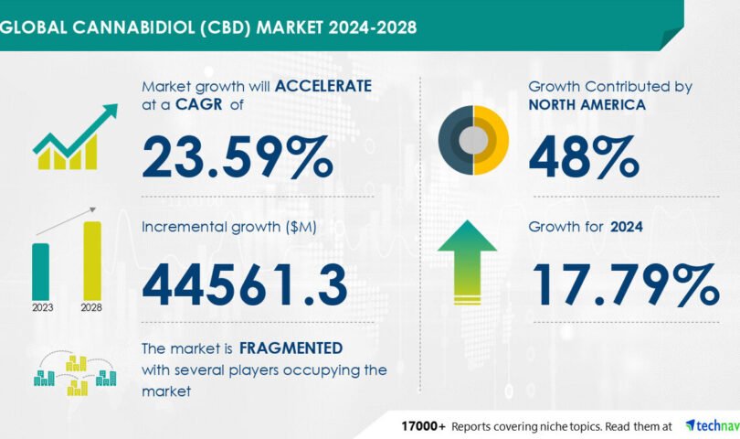 NEW YORK, Aug. 7, 2024 /PRNewswire/ — The global cannabidiol (CBD) market  size is estimated to grow by USD 44.56 billion from 2024-2028, according to Technavio. The market is estimated to grow at a CAGR of almost 23.59%  during the forecast period.  Legalization and regulatory changes with respect to cannabidiol is driving market growth, with a trend towards growth in e-commerce industry. However, high cost of cannabidiol products  poses a challenge. Key market players include Aurora Cannabis Inc., Cannabis Science Inc., Cannoid LLC, Canopy Growth Corp., Charlottes Web Holdings Inc., Cronos Group Inc., Elixinol, Endoca BV, Folium Biosciences, Isodiol International Inc., Medical Marijuana Inc., MediPharm Labs Inc., Medterra CBD, NuLeaf Naturals LLC, PharmaHemp d.o.o., Tikun Olam, and Tilray Brands Inc..