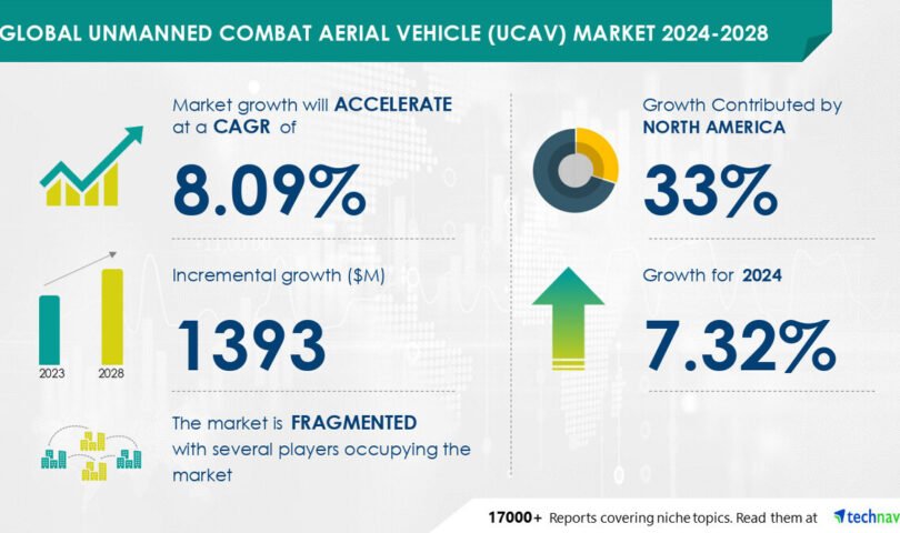NEW YORK, Aug. 7, 2024 /PRNewswire/ — The global unmanned combat aerial vehicle (UCAV) market size is estimated to grow by USD 1.39 billion from 2024-2028, according to Technavio. The market is estimated to grow at a CAGR of over 8.09% during the forecast period. Growing export demand from smaller economies is driving market growth, with a trend towards development of long-range spy combat drone. However, rapid development of anti-drone technology poses a challenge. Key market players include Aeronautical Systems Inc., AeroVironment Inc., BAE Systems Plc, Baykar Tech, Bluebird Aero Systems, C Astral d.o.o., China Aerospace Science and Technology Corp., Dassault Aviation SA, Denel Dynamics, Edge Autonomy, Elbit Systems Ltd., General Atomics, Israel Aerospace Industries Ltd., Kratos Defense and Security Solutions Inc., Lockheed Martin Corp., Northrop Grumman Corp., Parrot Drones SAS, Skyeton, Textron Inc., The Boeing Co., and Ukrspecsystems.
