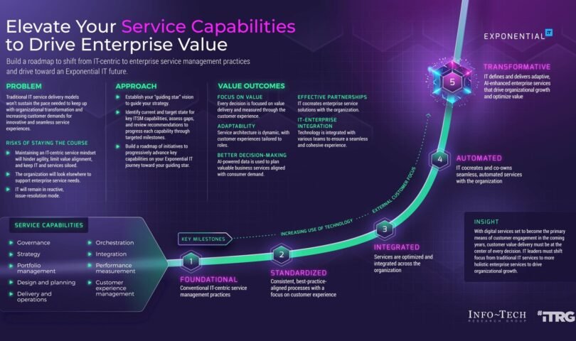 TORONTO, Aug. 9, 2024 /PRNewswire/ – As organizations face growing force to modernize and digitize their operations, many IT leaders are suffering with out of date IT provider control (ITSM) practices that fail to satisfy the calls for of recent virtual enterprises. To aid IT navigate those demanding situations, Information-Tech Analysis Workforce has printed its original blueprint, Elevate Your Service Capabilities to Drive Enterprise Value. The brandnew useful resource supplies insights on how IT leaders can grow to be their provider control methods into an undertaking provider control (ESM) framework. The company advises that through integrating complicated applied sciences like generative AI, IT leaders can assure their provider control practices don’t seem to be simplest aligned with organizational targets but in addition situated to pressure important enlargement and improve buyer reviews in an more and more aggressive marketplace.