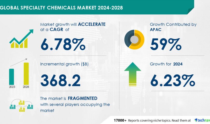 NEW YORK, Aug. 13, 2024 /PRNewswire/ — The worldwide uniqueness chemical compounds marketplace measurement is estimated to develop by way of USD 368.2 billion from 2024-2028, consistent with Technavio. The marketplace is estimated to develop at a CAGR of 6.78% right through the forecast duration. Expanding call for for uniqueness chemical compounds from agrochemical trade is riding marketplace expansion, with a development in opposition to rising call for for bio-based chemical compounds. On the other hand, stringent rules and insurance policies in opposition to uniqueness chemical compounds poses a problem. Key marketplace gamers come with Albemarle Corp., Ashland Inc., BASF SE, Beardow and Adams Adhesives Ltd., Clariant Global Ltd., Danimer Medical Inc., Dow Chemical Co., Dymax Corp., Evonik Industries AG, Exxon Mobil Corp., H.B. Fuller Co., Henkel AG and Co. KGaA, Huntsman Global LLC, Lanxess AG, Nouryon Chemical compounds Keeping BV, PPG Industries Inc., Prince Global Corp., Saudi Arabian Oil Co., Shree Ganesh Treatments Ltd., and Solvay SA.