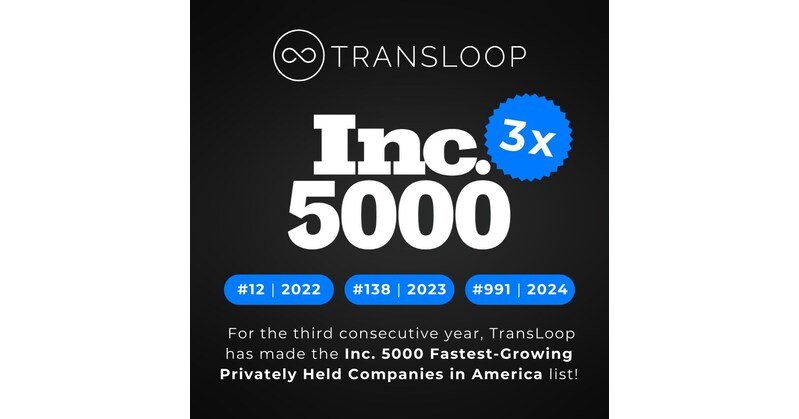 CHICAGO, Aug. 14, 2024 /PRNewswire/ — Inc. Magazine recently released their annual Inc. 5000 award honoree list, naming TransLoop a top 1000 fastest-growing private company in America, ranking at #991.