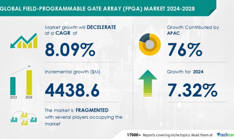 NEW YORK, Aug. 14, 2024 /PRNewswire/ — The worldwide field-programmable gate array (FPGA) marketplace measurement is estimated to develop via USD 4.43 billion from 2024-2028, in step with Technavio. The marketplace is estimated to develop at a CAGR of over 8.09% throughout the forecast length. Prime adoption of smartphones and capsules globally is riding marketplace enlargement, with a development against greater proliferation of IoT. Alternatively, cloning considerations in fpga design poses a problem. Key marketplace avid gamers come with Achronix Semiconductor Corp., Complicated Micro Units Inc., Berkshire Hathaway Inc., Broadcom Inc., Efinix Inc., Flex Logix Applied sciences Inc., GlobalSpec LLC, GOWIN Semiconductor Corp., Infineon Applied sciences AG, Intel Corp., iWave Programs Applied sciences Pvt. Ltd., Lattice Semiconductor Corp., Menta SAS, Microchip Generation Inc., NXP Semiconductors NV, QuickLogic Corp., Siemens AG, Silicon Creations, SoftBank Crew Corp., and Synopsys Inc..