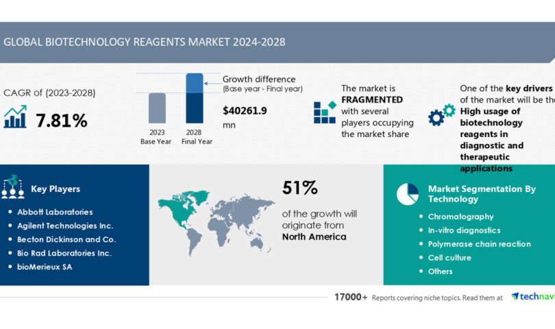 NEW YORK, Aug. 22, 2024 /PRNewswire/ — The global biotechnology reagents market size is estimated to grow by USD 40.26 billion from 2024-2028, according to Technavio. The market is estimated to grow at a CAGR of 7.81% during the forecast period. High usage of biotechnology reagents in diagnostic and therapeutic applications is driving market growth, with a trend towards increasing stem cell and biomedical research. However, stringent regulations poses a challenge. Key market players include Abbott Laboratories, Agilent Technologies Inc., Becton Dickinson and Co., Bio Rad Laboratories Inc., bioMerieux SA, Danaher Corp., F. Hoffmann La Roche Ltd., Illumina Inc., Lonza Group Ltd., Merck KGaA, Meridian Bioscience Inc., New England Biolabs Inc., Perkin Elmer Inc., Promega Corp., QIAGEN NV, Siemens AG, Sysmex Corp., Thermo Fisher Scientific Inc., Tosoh Corp., and Waters Corp..