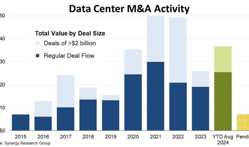 Since 2015 Synergy has logged a total of 1,381 data center-oriented M&A deals, with an aggregate value of $276 billion. Most of this comes from company acquisitions, but the numbers also include minority equity investments, investments in joint ventures, acquisitions of individual data centers, share sales and acquisition of land for data center development. The four $10 billion-plus deals that closed in 2021 and 2022 were the acquisitions of CyrusOne, Switch, CoreSite and QTS. All four acquired companies feature in the worldwide top 15 ranking of colocation operators, while they are ranked in the top seven in the US market. The biggest deals to close so far in 2024 are the equity investments in Vantage Data Centers and EdgeConneX. Apart from the rapid rise in overall data center M&A activity over the ten-year period, the most notable feature has been the extent to which private equity has flooded into the market. In 2020 private equity accounted for 54% of the value of closed deals, rising to 65% in 2021, and since then it has remained in the 85-90% range.