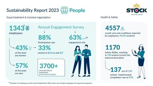 Además de la estrategia Personas, Planeta y Procesos, Stock Spirits Group publica su Informe de sostenibilidad. En 2023, el Grupo dio pasos importantes en materia de desarrollo sostenible, completando proyectos clave como la construcción de una destilería de última generación en Lublin (Polonia), con una inversión de 50 millones de euros. En septiembre de 2023, la empresa completó cuatro adquisiciones estratégicas: el whisky escocés Clan Campbell y Dugas en Francia, Polmos Bielsko – Biala en Polonia y Borco (ahora Stock Spirits GmbH) en Alemania. Estos movimientos han fortalecido la posición del Grupo en Europa (ahora la cuarta posición en términos de participación de mercado en valor y volumen en 2023[3] en Europa) y han allanado el camino para impulsar prácticas sostenibles dondequiera que esté presente.
