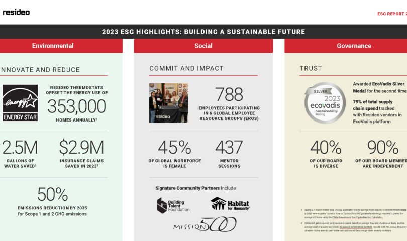 Resideo’s 2023 report is another meaningful step in its ESG journey and commitment to speaking transparently about its goals for environmental sustainability. More information about Resideo’s sustainability journey can be found at Resideo.com/sustainability, where the full ESG report is available for download.