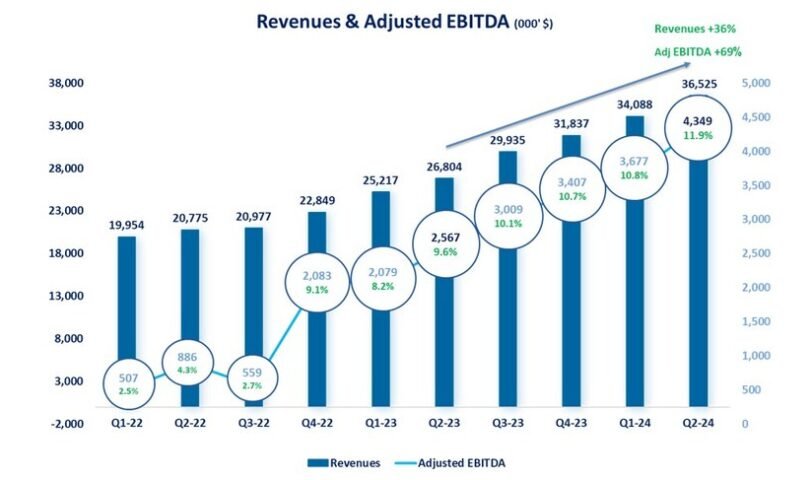 - Adjusted EBITDA increased by 69.4% to $4.3 million (11.9% of revenues) compared to $2.6 million (9.6% of revenues) in the second quarter of 2023. Adjusted EBITDA for the first half of 2024 increased by 73% to $8 million compared $4.6 in the first half of 2023 (11.4% of revenues in H1\24 compared to 9% in H1\23).