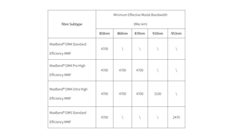 YOFC’s MaxBand® OM4 Pro/Ultra series of MMFs are fully compatible with existing OM4 and OM5 fibre optic standards, as well as systems based on these standards.