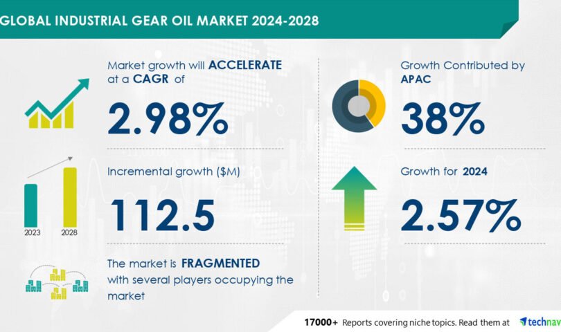 NEW YORK, Oct. 3, 2024 /PRNewswire/ — Report with the AI impact on market trends- The global industrial gear oil market size is estimated to grow by USD 112.5 million from 2024-2028, according to Technavio. The market is estimated to grow at a CAGR of 2.98% during the forecast period. Growth in global construction industry is driving market growth, with a trend towards increasing number of industry-specific products. However, decrease in mining-related investments poses a challenge. Key market players include ADVANCED LUBRICATION SPECIALTIES, AMALIE OIL CO., Apar Industries Ltd., BASF SE, BP Plc, Chevron Corp., China Petrochemical Corp., Croda International Plc, Dyade Lubricants B.V., Exxon Mobil Corp., FUCHS PETROLUB SE, Gandhar Oil Refinery India Ltd., Hinduja Group Ltd., Petroleos de Venezuela SA, Petromin Corp., PJSC LUKOIL, Shell plc, TotalEnergies SE, United Grease and Lubricants, and Valvoline Inc..