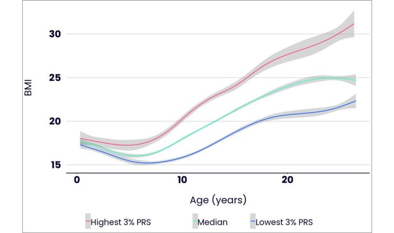 By the time a child reaches their 4th birthday, their BMI is already associated with their genetics. Adults in their 20’s with relatively high PRS scores for BMI will typically experience, over the next twenty years of their lives, an increase in BMI which is three times that experienced by those with relatively low PRS scores.