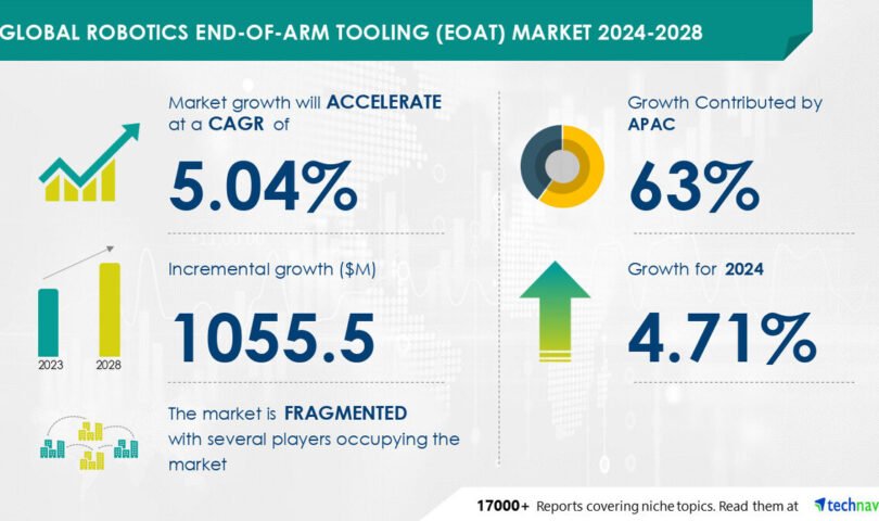 NEW YORK, Oct. 15, 2024 /PRNewswire/ — Record on how AI is redefining marketplace landscape- The worldwide robotics end-of-arm tooling (eoat) marketplace measurement is estimated to develop through USD 1.05 billion from 2024-2028, consistent with Technavio. The marketplace is estimated to develop at a CAGR of five.04% all through the forecast duration. Arise in call for for modular end-of-arm-tooling is riding marketplace progress, with a development against utility of fdm and additive production in end-of-arm-tooling production. On the other hand, elevated price of deployment of commercial robots restricting call for for robotics end-of-arm-tooling poses a problem. Key marketplace gamers come with ASS Maschinenbau GmbH, Barnes Workforce Inc., Coval Vaccum Generation Inc., Dover Corp., Effecto Workforce S.p.A., EMI Corp., Festo SE and Co. KG, FIPA GmbH, IPR GmbH, Novanta Inc., OnRobot AS, Piab AB, Robotiq Inc., RoboTool Inc., SCHUNK GmbH and Co. KG, Comfortable Robotics Inc., Toyota Industries Corp., and Zimmer Workforce GmbH.