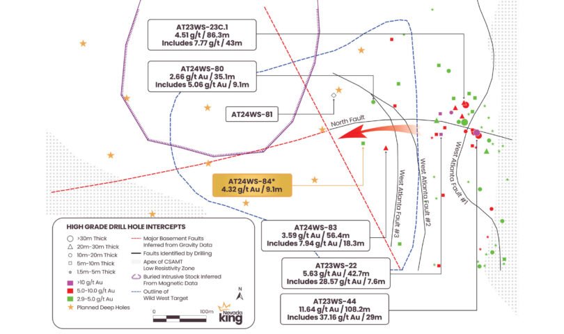Cal Herron, Exploration Manager of Nevada King, stated, “The WWZ is situated along a major east-west basement lineament interpreted from gravity data that projects approximately 3 kilometres eastward from the Silver Park, Mustang, and Outlaw Targets (Figure 2) through the centre of the Wild West Target and into the Atlanta resource zone where it connects to the North Fault, which is an important structural control associated with high-grade mineralization immediately northwest of the pit. Nevada King holes AT23WS-44 (11.64 g/t Au over 108.2m, including 37.16 g/t Au over 29.0m released October 2, 2023), AT23WS-22 (5.63 g/t Au over 42.7m, including 28.57 g/t Au over 7.6m released April 27, 2023) and AT24WS-83 (4.67 g/t Au over 42.7m released August 19, 2024) all occur along this trend.