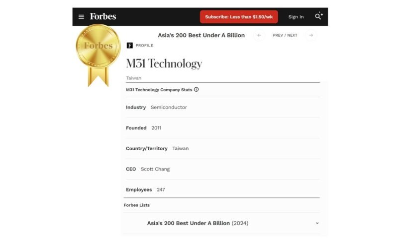 HSINCHU, Oct. 23, 2024 /PRNewswire/ — M31 Technology Corporation (M31), a leading global developer of silicon intellectual property (IP), has once again been recognized by the prestigious financial magazine Forbes Asia. M31 has been ranked in the “2024 Forbes Asia Best Under a Billion” list, highlighting the top 200 small and medium-sized publicly listed companies in Asia. This ranking identified the 200 most growth-driven, well-managed, and profitable small and medium-sized enterprises from over 20,000 publicly listed companies with annual revenues below $1 billion across 16 countries in the Asia-Pacific region.