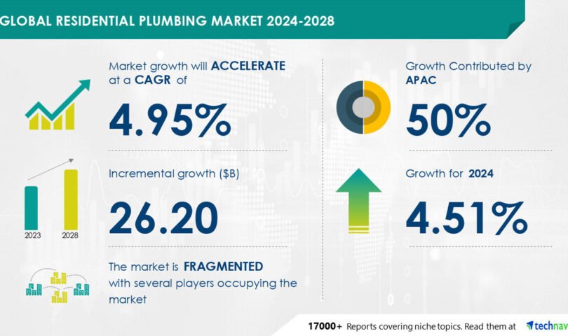 NEW YORK, Oct. 25, 2024 /PRNewswire/ — Report with market evolution powered by AI – The Global Residential Plumbing Market size is estimated to grow by USD 26.20 billion from 2024-2028, according to Technavio. The market is estimated to grow at a CAGR of 4.95%  during the forecast period. Rise in number of residential buildings globally is driving market growth, with a trend towards advent of eco-friendly plumbing solutions. However, high cost and maintenance of residential plumbing  poses a challenge.Key market players include American Bath Group, Astral Ltd., Bradford White Corp., Chemed Corp., Colston Bath, Credo Trading, Elkay Manufacturing Co., Geberit International AG, Globe Union Industrial Corp., Home Depot Inc., Kohler Co., LIXIL Corp., Lowes Co. Inc., Masco Corp., Moen Inc., Reliance Worldwide Corp. Ltd., Rheem Manufacturing Co., The Supreme Industries Ltd., Toto Ltd., and Uponor Corp..