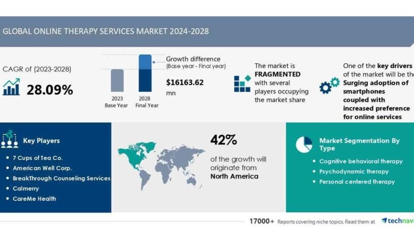 NEW YORK, Oct. 30, 2024 /PRNewswire/ — Report with market evolution powered by AI – The global online therapy services market  size is estimated to grow by USD 16.16 billion from 2024-2028, according to Technavio. The market is estimated to grow at a CAGR of  28.09%  during the forecast period. Adoption of smartphones coupled with increased preference for online services is driving market growth, with a trend towards growing popularity of online health services. However, privacy concerns related to patient mental health issues  poses a challenge.Key market players include 7 Cups of Tea Co., American Well Corp., BreakThrough Counseling Services, Calmerry, CareMe Health, Cerebral Inc., Doctor On Demand Inc., DocVita Inc., Felicity, Heart it out, Manastha, MDLIVE Inc., Mind Voyage, ReGain, TALKSPACE INC, Teladoc Health Inc., ThriveTalk, Thriveworks Counseling, HopeQure Wellness Solutions Pvt. Ltd., and Mental Fuel Inc..
