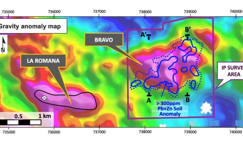 Figure 1 – Bravo gravity target and Pb+Zn soil anomaly, showing the IP survey location and helicopter electromagnetic cross-sections (A-A’, and B-B’). The map also highlights the proximity to the La Romana gravity anomaly and copper discovery.