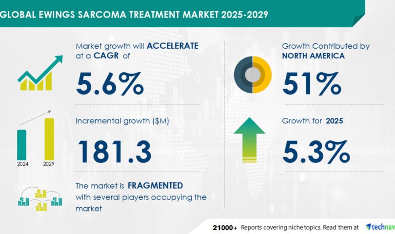 NEW YORK, Jan. 20, 2025 /PRNewswire/ — Report on how AI is redefining market landscape – The global ewings sarcoma treatment market size is estimated to grow by USD 181.3 million from 2025-2029, according to Technavio. The market is estimated to grow at a CAGR of 5.6% during the forecast period. Growing awareness about and funding for ewings sarcoma is driving market growth, with a trend towards emergence of regenerative therapies. However, lack of approved therapies for ewings sarcoma poses a challenge. Key market players include Actiza Pharmaceutical Pvt. Ltd., Advantech Co. Ltd., Amneal Pharmaceuticals Inc., Baxter International Inc., Bristol Myers Squibb Co., Cellectar Biosciences Inc., Daiichi Sankyo Co. Ltd., Eli Lilly and Co., Fresenius Kabi AG, GlaxoSmithKline Plc, Gradalis Inc., Johnson and Johnson Inc., LGM Pharma LLC, Merck and Co. Inc., Novartis AG, Ocean pharmaceutical, Pfizer Inc., PharmaMar SA, Salvavidas, and UPMC Hillman Cancer Center.