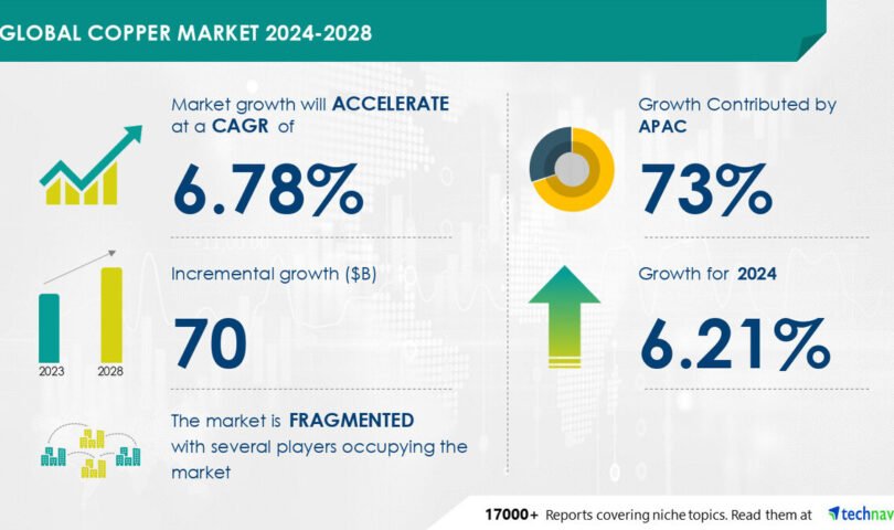 NEW YORK, Jan. 21, 2025 /PRNewswire/ — Report on how AI is redefining market landscape – The global copper market size is estimated to grow by USD 70 billion from 2024-2028, according to Technavio. The market is estimated to grow at a CAGR of 6.78% during the forecast period. High demand for copper from APAC is driving market growth, with a trend towards technological innovations driving the demand for copper. However, fluctuation in copper prices poses a challenge. Key market players include ABC Gas International Ltd., Anglo American plc, Antofagasta plc, Aurubis AG, Baroda Extrusion Ltd., Bhagyanagar India Ltd., BHP Group Ltd., Corporacion Nacional del Cobre de Chile, First Quantum Minerals Ltd., Freeport McMoRan Inc., Glencore Plc, Grupo Mexico S.A.B. De C.V., Hindalco Industries Ltd., Hindustan Copper Ltd., KGHM Polska Miedz SA, Madhav Copper Ltd., Rio Tinto Ltd., Vale SA, and Vedanta Ltd..