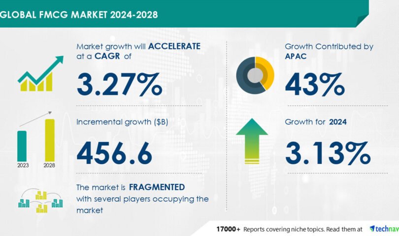 NEW YORK, Jan. 22, 2025 /PRNewswire/ — Report on how AI is driving market transformation – The global FMCG market size is estimated to grow by USD 456.6 billion from 2024-2028, according to Technavio. The market is estimated to grow at a CAGR of 3.27% during the forecast period. Growing preference for e-commerce online distribution is driving market growth, with a trend towards rising consumption of ready-to-eat food products. However, lack of proper infrastructure in emerging economies poses a challenge. Key market players include Anheuser Busch InBev SA NV, Dabur India Ltd., Heineken NV, ITC Ltd., JBS SA, Johnson and Johnson Services Inc., Kellogg Co., Keurig Dr Pepper Inc., Kimberly Clark Corp., LOreal SA, Mondelez International Inc., Nestle SA, Patanjali Ayurved Ltd., PepsiCo Inc., Tata Sons Pvt. Ltd., The Coca Cola Co., The Kraft Heinz Co., The Procter and Gamble Co., The Wadia Group, and Unilever PLC.