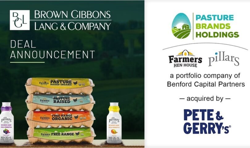 CHICAGO, Jan. 29, 2025 /PRNewswire/ — Brown Gibbons Lang & Company (BGL), a leading independent investment bank and financial advisory firm, is pleased to announce the sale of Pasture Brands Holdings (Pasture Brands), a Better-For-You (BFY) food platform focused on perimeter-of-store refrigerated products and a portfolio company of Benford Capital Partners (BCP), to Pete & Gerry’s Organics, LLC (PGO), a leading specialty egg company. BGL’s Food and Beverage investment banking team served as the exclusive financial advisor to Pasture Brands. This deal marks BGL’s seventh transaction in the food & beverage sector since January 2024 and builds upon BGL’s market leadership position in the BFY category and the broader branded consumer packaged goods space.