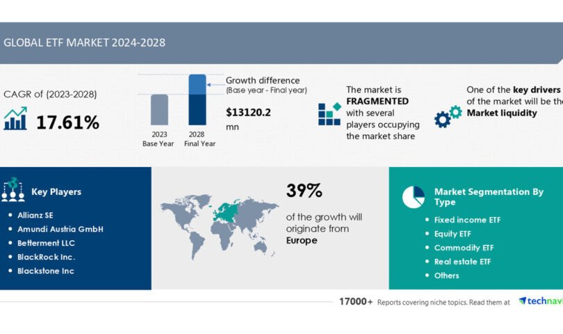 NEW YORK, Feb. 6, 2025 /PRNewswire/ — Report with market evolution powered by AI – The global ETF market size is estimated to grow by USD 13.12 billion from 2024-2028, according to Technavio. The market is estimated to grow at a CAGR of 17.61% during the forecast period. Market liquidity is driving market growth, with a trend towards growth of bond etfs. However, transaction risks poses a challenge. Key market players include Allianz SE, Amundi Austria GmbH, Betterment LLC, BlackRock Inc., Blackstone Inc, FMR LLC, Invesco Ltd., JPMorgan Chase and Co., Mirae Asset Securities Co. Ltd., Morgan Stanley, Morningstar Inc., State Street Corp., The Bank of New York Mellon Corp., The Charles Schwab Corp., The Goldman Sachs Group Inc., The Vanguard Group Inc., UBS Group AG, and Wealthfront Corp..