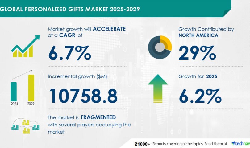 NEW YORK, Feb. 6, 2025 /PRNewswire/ — Report on how AI is redefining market landscape – The global personalized gifts market size is estimated to grow by USD 10.76 billion from 2025-2029, according to Technavio. The market is estimated to grow at a CAGR of 6.7% during the forecast period. Continuous development and introduction of new products is driving market growth, with a trend towards rising popularity of eco-friendly personalized gifts. However, seasonal nature of demand for personalized gift products poses a challenge. Key market players include American Greetings Corp., American Stationery Co. Inc., CafePress Inc., Card Factory Plc, Chococraft Creations Pvt. Ltd., Cimpress Plc, ESCO Technologies Inc., Etsy Inc., Fat Brain Toys LLC, Ferns N Petals Pvt. Ltd., funkypigeon.com Ltd., GIFTILIYA, Godiva Chocolatier Inc., Hallmark Card Inc., Personal Creations, Redbubble Ltd., Shutterfly Inc., Signature Gifts Inc., Spencer Gifts LLC, and Zazzle Inc..