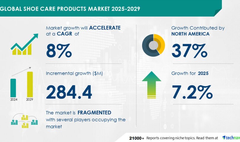 NEW YORK, Feb. 6, 2025 /PRNewswire/ — Report on how AI is driving market transformation – The global shoe care products market size is estimated to grow by USD 284.4 million from 2025-2029, according to Technavio. The market is estimated to grow at a CAGR of  8%  during the forecast period. Product innovation and product line extension leading to product premiumization is driving market growth, with a trend towards increased introduction of shoe care products made of natural ingredients. However, fluctuating raw material prices  poses a challenge. Key market players include Angelus Shoe Polish, C P Marketing Inc., C.A. Zoes Mfg Co., Caleres Inc., Fiebing Co. Inc., Grangers International Ltd., Implus Footcare LLC, Lincoln Shoe Polish, M. V. Shoe Care Pvt. Ltd., Moneysworth and Best Quality Shoe Care, OTTER WAX LLC, Payless Shoe Source Inc., Rocket Pure Care LLC, S.C. Johnson and Son Inc., Salzenbrodt GmbH and Co. KG, Shinola, TARRAGO BRANDS INTERNATIONIAL, S.L., The Clinkard Group Ltd., TRG BESTNETS SL, and Woodland Worldwide.